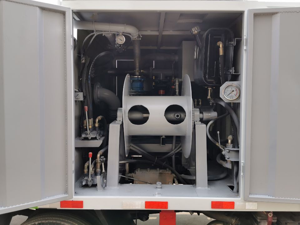 帶高壓清洗功能和灑水功能設(shè)計(jì)結(jié)構(gòu)合理,性能優(yōu)良,操作靈活簡便,主要配套件全部采用國內(nèi)外通用標(biāo)準(zhǔn)件,維修方便。主要采用雙頭取力系統(tǒng)、傳動(dòng)系統(tǒng)、水路系統(tǒng)、液壓系統(tǒng)、過濾系統(tǒng)、卷管器及操作系統(tǒng),通過高壓水泵將儲(chǔ)水罐中的水經(jīng)過高壓膠管,從高壓噴頭的孔向后噴出高壓水,利用水的反作用力使噴頭帶動(dòng)膠管自動(dòng)進(jìn)入下水道的深處,從而達(dá)到?jīng)_洗、疏通下水道中的污泥、雜物等目的。